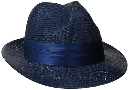 Its Main Features: This Stacy Adams hat is made of 100 % of Toyo Straw. This hat has the design of a fedora hat with a creased crown and a flat brim in the solid Navy color. The width of the brim is 2.25 inches. This hat features a ribbon hat band of the matching color and a feather attached to the hat band as well along with a twill sweatband and a thermal cord in the brim. The sizes of this hat include medium to xx-large.